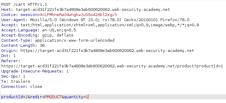The item’s productID and quantity are specified in the POST body and sent to the server (The productId=1 represents our Lightweight l33t leather jacket).
