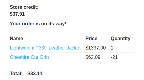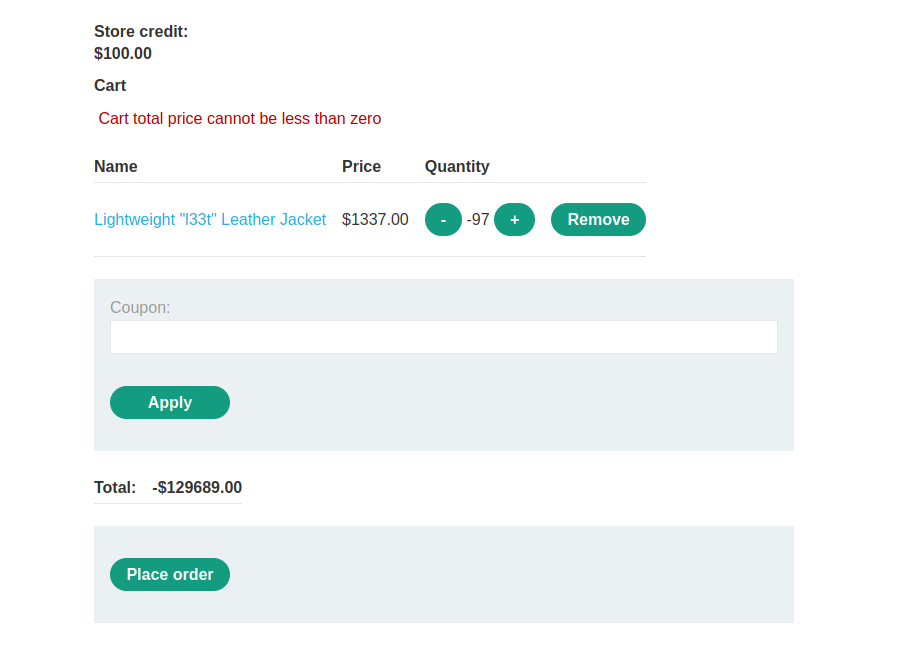 However, since we can add negative quantities for items, we can use them to make the cart’s value lower (while keeping it positive). In this way we are able to afford our dream jacket.