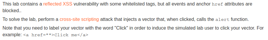 Lab: https://portswigger.net/web-security/cross-site-scripting/contexts/lab-event-handlers-and-href-attributes-blocked