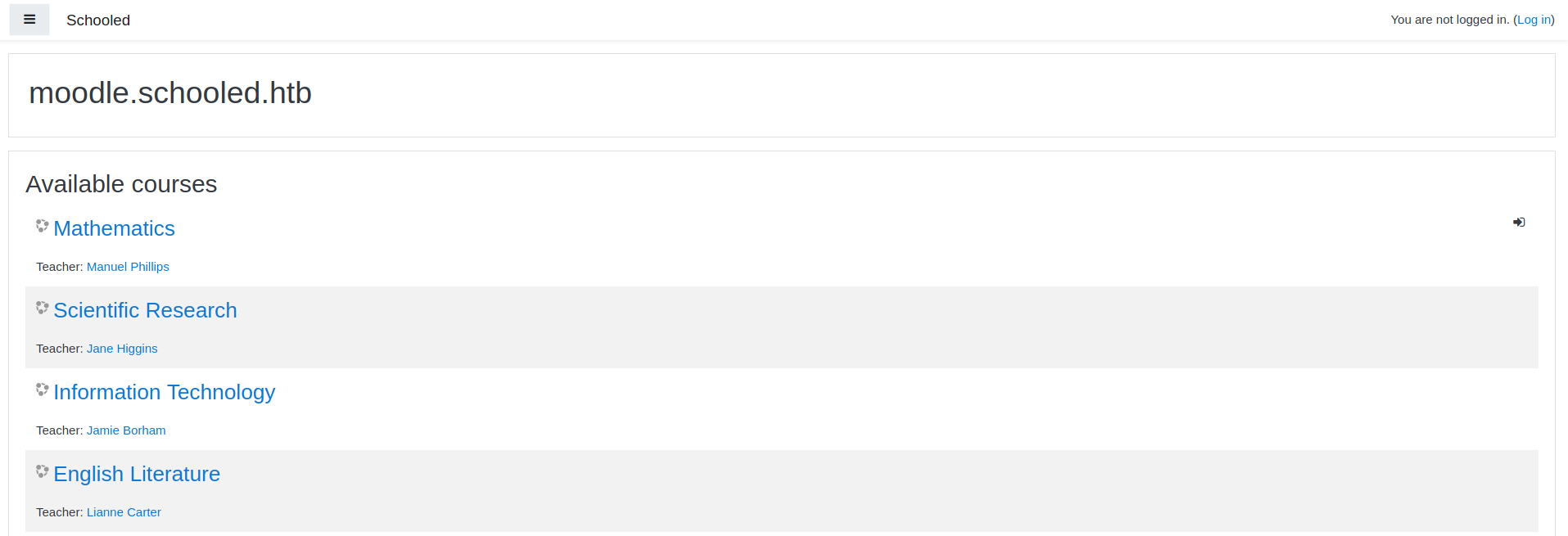 We create an account and log in to Moodle. The mail we register needs to have a student.schooled.htb domain.