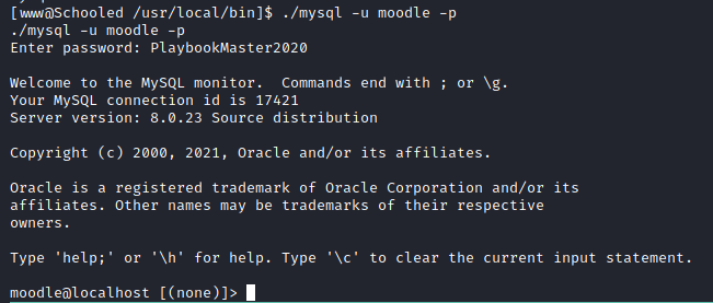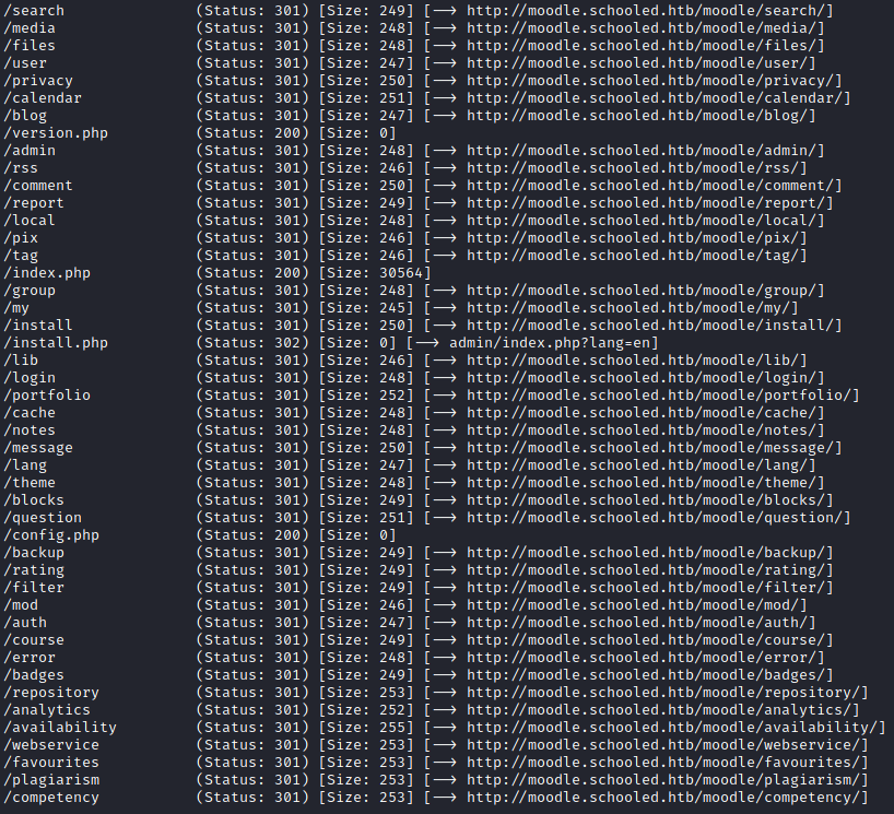 gobuster dir -u http://moodle.schooled.htb/moodle/ -w /usr/share/wordl[0/8]dirbuster/directory-list-2.3-medium.txt -o gobuster-moodle.txt -t 40 -x php,db