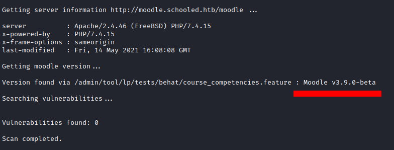 We run it with python3 moodlescan.py -k -u http://moodle.schooled.htb/moodle.