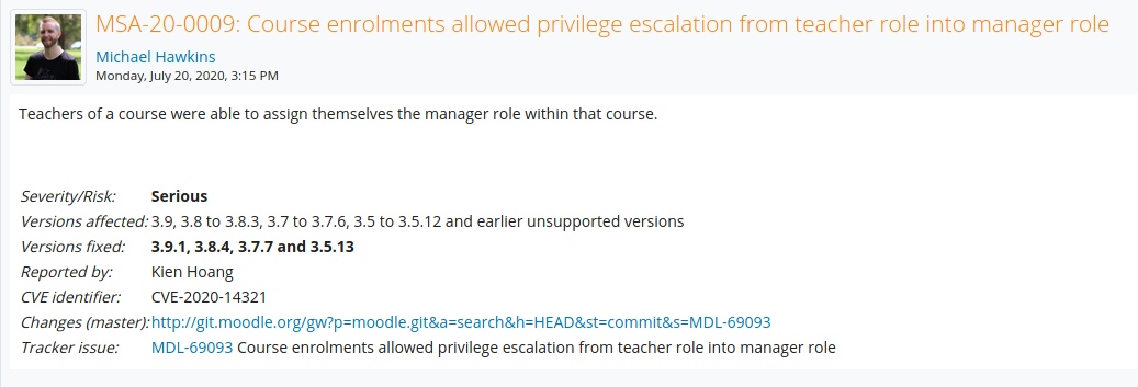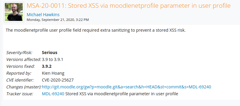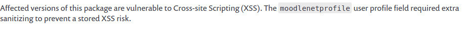 A high impact XSS vulnerability stands out for the unsufficient sanitization of the moodlenetprofile (also mentioned in the announement).
