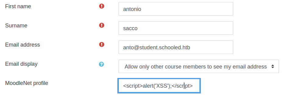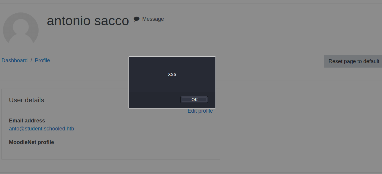 As guessable by the announcment, the teacher will visit the student’s profile therefore suggesting an XSS vulnerability.