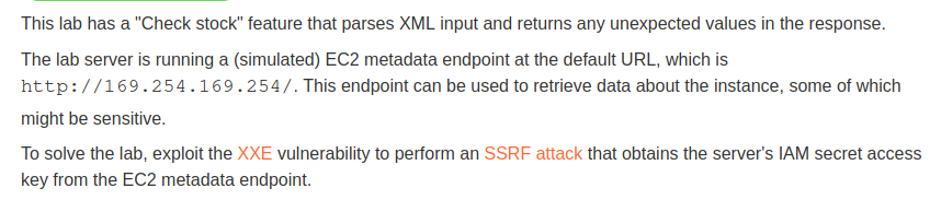 Link: https://portswigger.net/web-security/xxe/lab-exploiting-xxe-to-perform-ssrf