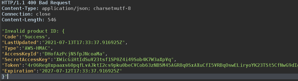 We know that it is vulnerable to XXE. We can access the EC2 metadata endpoint and look for the IAM secret. With some googling and trial and error we find the correct path to the IAM secret credentials, namely http://169.254.169.254/latest/meta-data/iam/security-credentials/admin